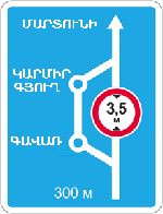 | 8.11 | «Թույլատրելի առավելագույն զանգվածի սահմանափակում». տեղեկացնում է, որ նշանի ազդեցությունը տարածվում է միայն այն տրանսպորտային միջոցների վրա, որոնց թույլատրելի առավելագույն զանգվածը մեծ է ցուցանակի վրա նշվածից. | |||||||