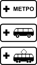 «Ընդհանուր օգտագործման տրանսպորտային միջոցի տեսակը». Կիրառվում են 6.4 նշանի հետ և ցույց տալիս մետրոյի կայարանների, ավտոբուսի (տրոլեյբուսի) կամ տրամվայի կանգառների մոտ գտնվող տրանսպորտային միջոցների կայանման համար նախատեսված հրապարակները. | ||||||
