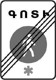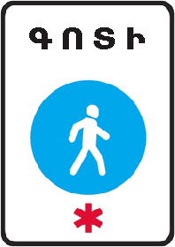 | 8.15 | «Կույր հետիոտներ». տեղեկացնում է, որ հետիոտնային անցումից օգտվում են կույրերը: Կիրառվում է 1.22, 5.19.1 և 5.19.2` «Հետիոտնային անցում» նշանների և լուսացույցների հետ. | |||||||